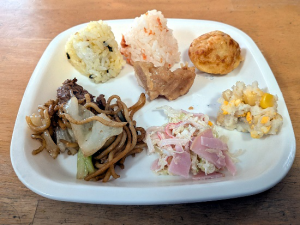 今年のメニューは、たこ焼きに焼きそば、おにぎり、からあげ、サラダです。