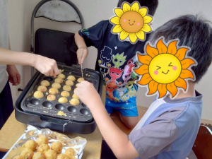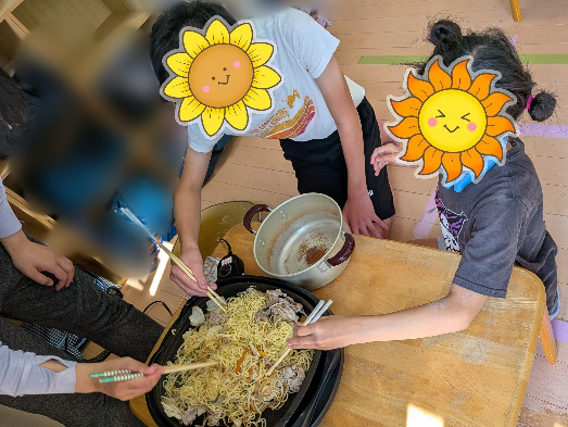 ホットプレートを使うたこ焼き・焼きそばチームからは「先生、暑いよー!」という声が聞こえます。
