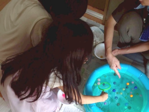 スーパーボールすくいでは、お気に入りのものを探して慎重に狙います。