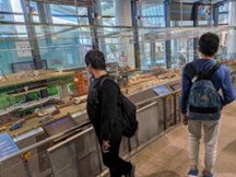 ジオラマの中の作業員が準備体操をしている模型を指さして、「運動しているよ。」と教えてくれたり、