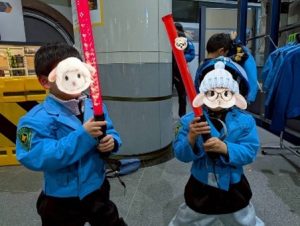 制服とヘルメットを着用したら、誘導棒を持って決めポーズ!