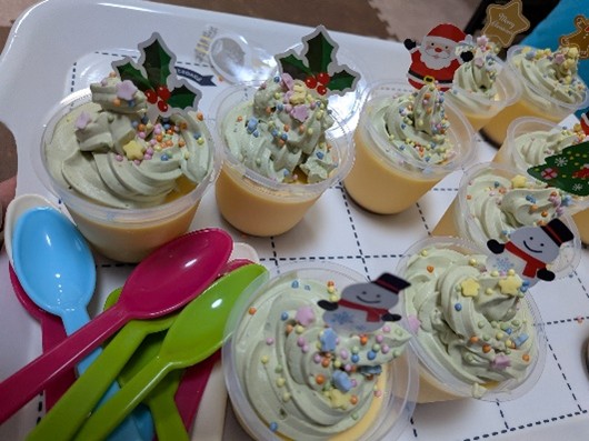 抹茶味のクリームに、「いつものと違うな…」と渋い顔をする子や、「おいしい」と笑顔の子がいました。