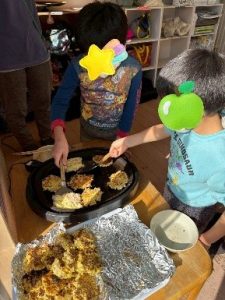 時計を見ながら焼き時間のタイムキーパーをしたり、「先生、煙が出てきたよ。もう蓋取る?」と確認しながら沢山のお好み焼きを作りました。