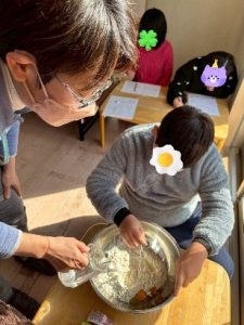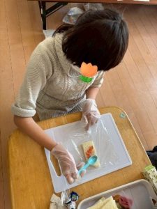 ジャムロールを担当した子は、クルクルと巻くのが難しく、「上手く巻けな~い」と言いながらも頑張って作ってくれていました。