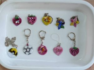 焼きあがった作品は、それぞれが選んだパーツを付けてもらいペンダントやキーホルダーになりました。