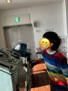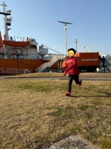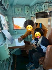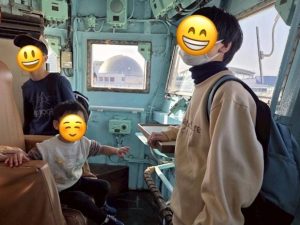 全長100mの大きなオレンジ色の船、南極観測船ふじの船内にも入りました。操縦室や医務室、乗組員さんの部屋などが当時のまま残されていて、南極への旅をしているような気分に。マネキン人形を見て「本物の人かと思った!」とびっくりする子もいて、大はしゃぎでした。
