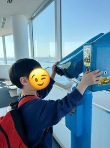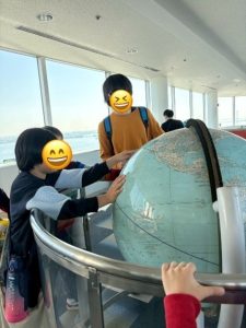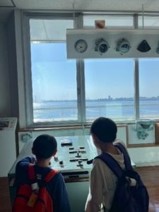 まずはエレベーターで7階の展望台へ。高いところから見る名古屋港はとってもキレイで、「わあ!」「ひろーい!」と子どもたちの声があちこちから聞こえてきました。