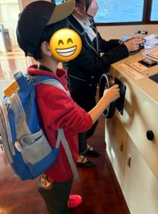 中でも大人気だったのが「おたのしみブリッジ」ゾーン。実物そっくりの舵輪やレーダーを使って、船のブリッジがリアルに再現されています。船長さんの制服を着て、すっかり船長気分の子どもたちでした。