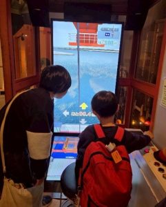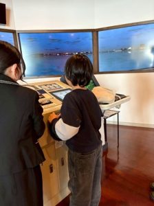 操船シミュレータでは、CGの映像を見ながら船を操縦する体験もでき、「むずかしい!」「たのしい!」と大盛り上がりでした。